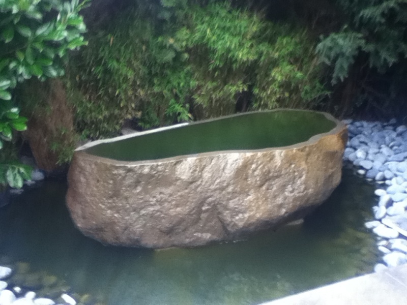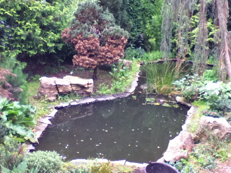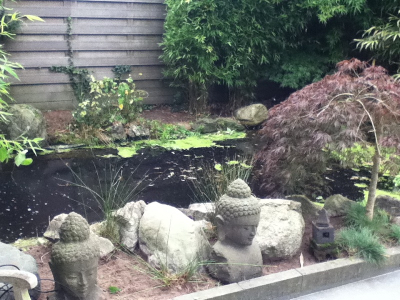 De grote vijver is gemaakt met rubberflex vijverfolie en met grote keien afgewerkt. Het water ornament is een uitgeholde kei geplaatst waar water overloopt op donker zwarte keien. De achterzijde is met dikke bamboe palen afgezet. Het ornament is geplaatst met een telekraan.