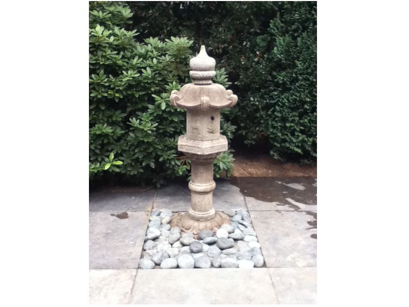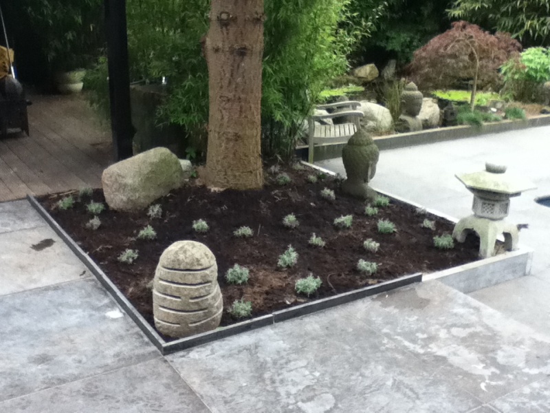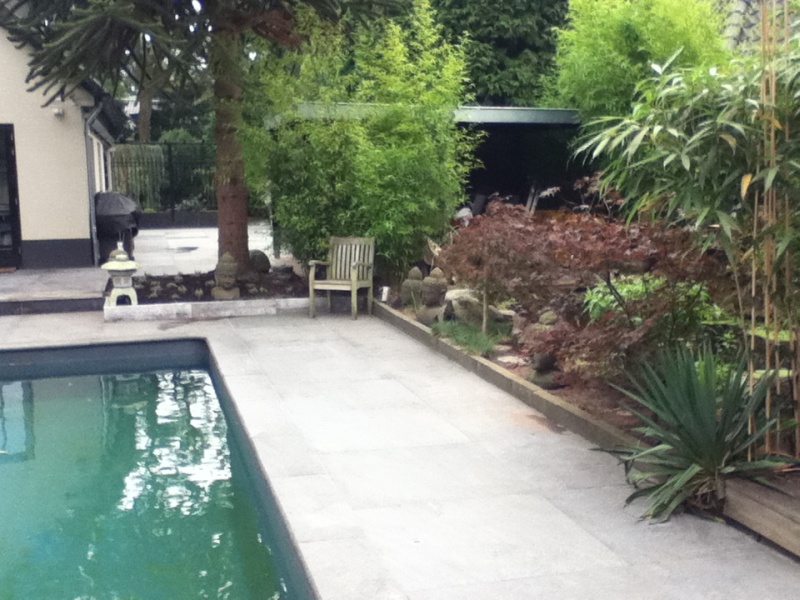 De bestaande Chinees hardsteen tegels zijn opnieuw in het bovengedeelte van de tuin gelegd. De tegels zijn gevoegd met Promaq voegmortel in de kleur steengrijs voor een mooiere uitstraling. De tegels zijn gelegd met een vacuümmachine.